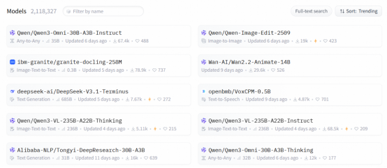 9月28日,全球最大 AI 開源社區 Hugging Face公布了新一期模型榜單,阿里通義7款模型入選全球前十開源模型榜單,幾乎實現屠榜,其中剛剛開源的全模態大模型Qwen3-Omni 登頂。