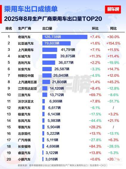 權威汽車媒體易車最新發布的出口數據顯示,比亞迪在乘用車出口領域表現亮眼。今年8月,比亞迪以79603輛的乘用車出口量位居生產廠商排名第二,同比增幅達154.5%,增速位列所有廠商之首。今年1-8月,其累計出口量攀升至601065輛,其中明星車型宋PLUS新能源以166699輛的銷量穩居車型出口榜首位,展現出強勁的國際市場競爭力。