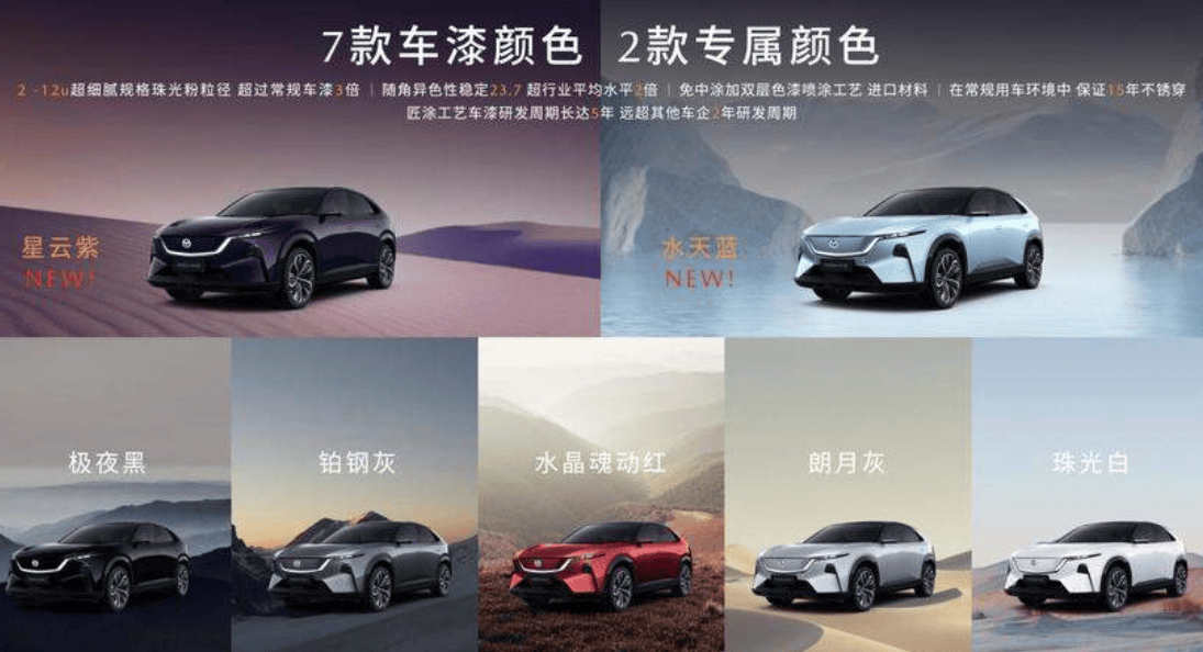 在新能源車型同質(zhì)化嚴(yán)重的背景下,EZ-60以馬自達(dá)“魂動(dòng)”美學(xué)為核心,通過百萬(wàn)級(jí)精工曲面設(shè)計(jì)、雙色懸浮車頂及專屬車漆打造獨(dú)特視覺體驗(yàn)。其中,“星云紫”與“水天藍(lán)”兩款車漆采用2-12μm超細(xì)膩珠光顆粒,隨角異色性達(dá)23.7,通過“濕碰濕”三層噴涂工藝實(shí)現(xiàn)30年抗腐蝕性能(鹽霧測(cè)試960小時(shí)無(wú)銹蝕)。車內(nèi)搭載的26.45英寸5K一體式大屏采用32:9畫幅比例,分辨率達(dá)同級(jí)最佳,灰態(tài)亮度小于0.5nit,并經(jīng)過-40℃至95℃循環(huán)沖擊測(cè)試及1000小時(shí)常溫穩(wěn)定性驗(yàn)證,搭配大視角補(bǔ)償膜技術(shù)確保觀感。