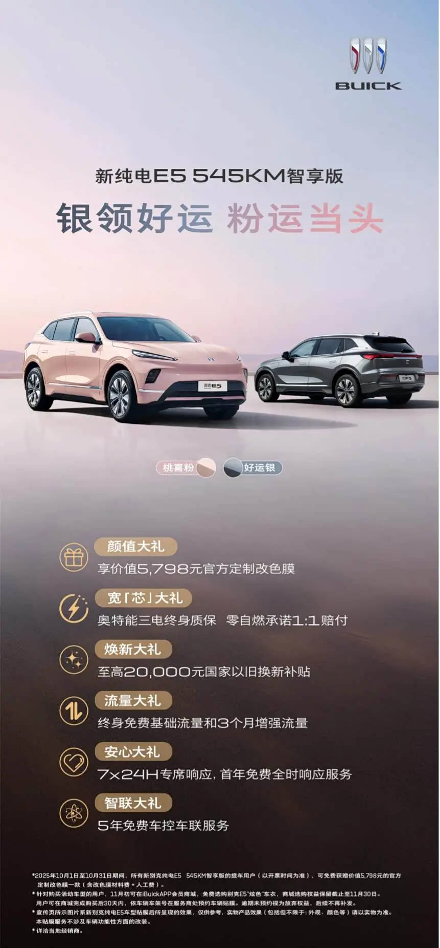 近日,別克品牌為旗下純電SUV別克E5推出一系列限時購車優惠,涵蓋價格直降、免費贈品及多項服務保障,為消費者提供更具吸引力的購車方案。
