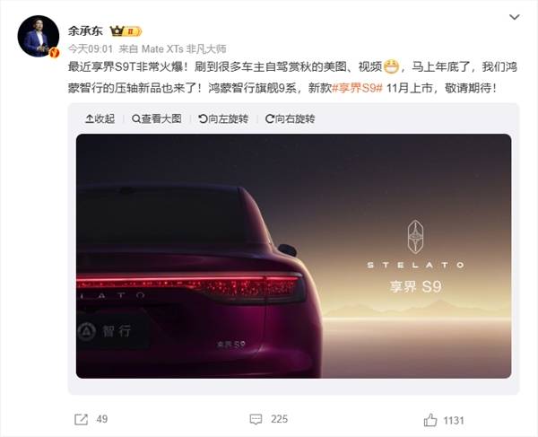 華為常務董事、終端BG CEO兼智能汽車解決方案BU董事長余承東近日通過社交媒體宣布,鴻蒙智行年度旗艦車型——新款享界S9將于11月正式上市。這一消息迅速成為汽車行業與消費市場的焦點,引發廣泛討論。