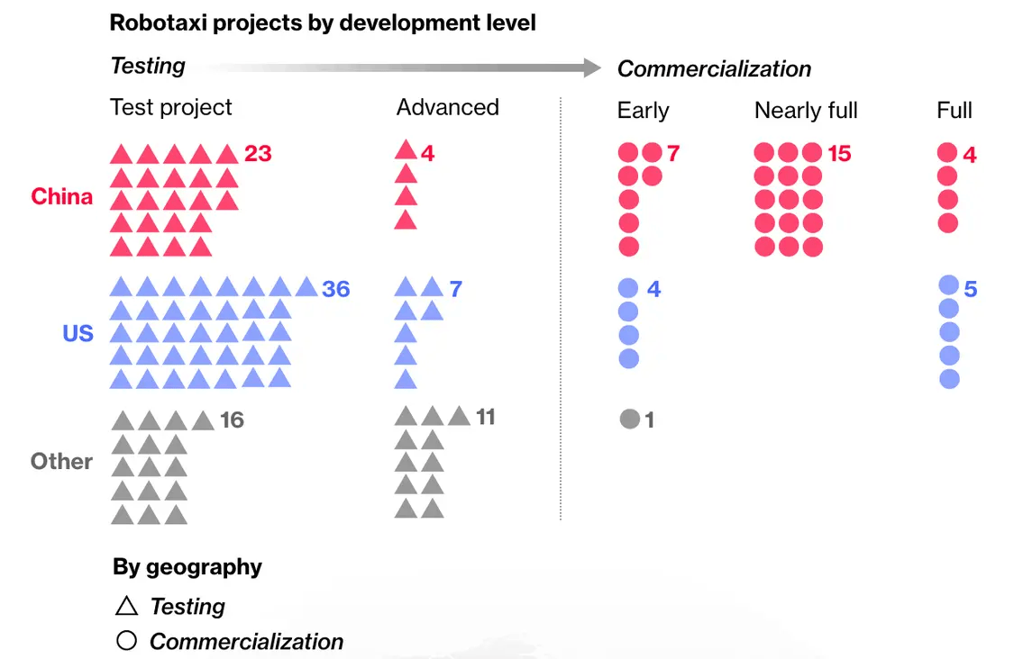 當Alphabet旗下Waymo憑借本土化無人駕駛車隊在美國市場占據主導地位時,中國自動駕駛企業正以更快的商業化步伐和更具競爭力的成本優勢,在全球市場掀起新一輪競爭浪潮。據彭博新能源財經最新數據顯示,百度蘿卜快跑、文遠知行和小馬智行三家中國企業的自動駕駛出租車項目數量已超越美國同行,且這些項目正從技術測試加速轉向規模化運營。