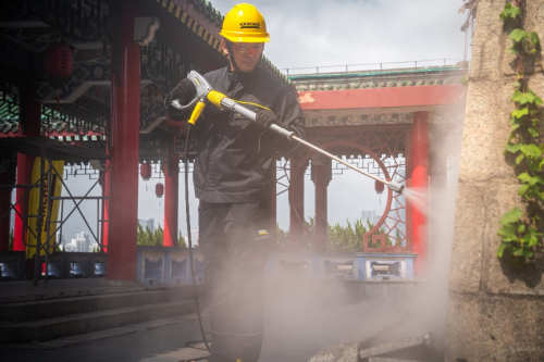 為杜絕古建損傷風(fēng)險,卡赫組建了一支由30名清潔專家組成的團(tuán)隊(duì),前期多次實(shí)地勘測——從污染區(qū)域分布、建筑材質(zhì)硬度,到墻體高度、石材紋理,每一處細(xì)節(jié)均精準(zhǔn)把控。最終確定以蒸汽清洗為核心方案,即選用卡赫熱水高壓清洗機(jī),通過95℃且壓力僅在0.5-1 bar的高溫低壓蒸汽沖擊石材表面,既能快速瓦解污垢,又避免損傷建筑肌理。同時,高溫蒸汽還可殺滅石材孔隙中的植物種子和孢子,有效延緩污垢再生。
