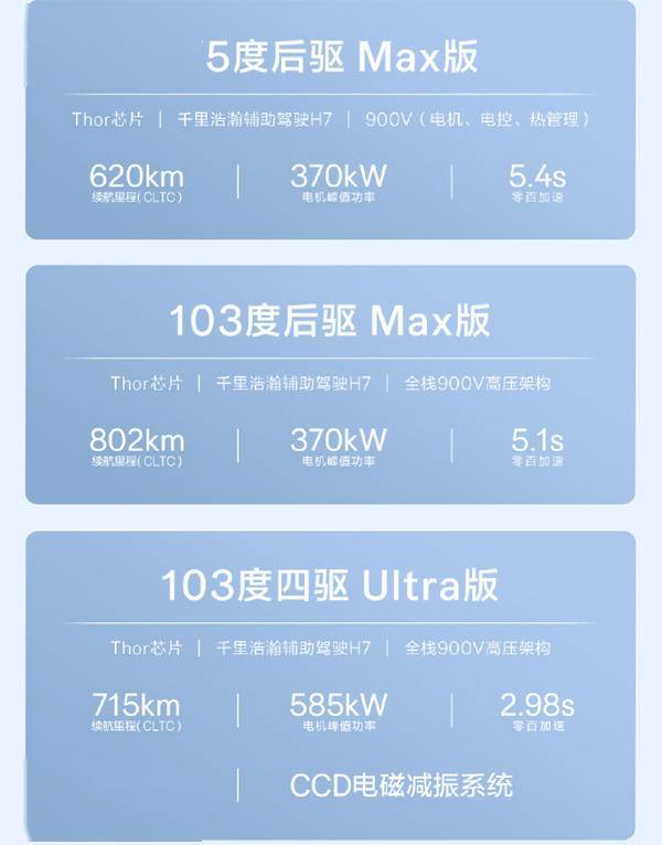 動力系統方面,三款車型呈現差異化布局。75度后驅Max版搭載75kWh神盾金磚電池,CLTC工況續航達620公里,配合370kW峰值功率電機,零百加速僅需5.4秒;103度后驅Max版升級至103kWh麒麟電池,續航提升至802公里,零百加速縮短至5.1秒;頂配四驅Ultra版采用雙電機布局,綜合功率高達585kW,零百加速僅2.98秒,最高車速可達255km/h,同時保持715公里CLTC續航能力。全系支持900V高壓快充架構,使用V3液冷極充樁時,10分鐘即可將電量從10%充至80%,補充續航最高約570公里。