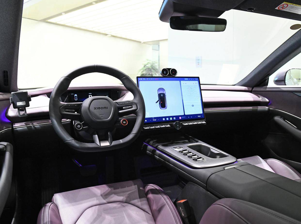 內飾設計延續了小米SU7的科技豪華路線,大面積真皮與Alcantara材質拼接,輔以植絨頂棚和銀色鍍鉻裝飾,營造出輕奢氛圍。座椅采用燈芯絨材質,搭配四點式安全帶的一體式桶椅,既保證包裹性又提升視覺質感。7.1英寸翻轉儀表、16.1英寸中控屏與HUD抬頭顯示組成三屏交互系統,驍龍8295芯片支持小米平板無縫連接,實現車載、平板、手機應用生態的全面打通,甚至兼容蘋果iPad設備。