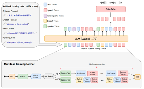 整體SoulX-Podcast模型基礎結構上采用了常用的LLM + Flow Matching的語音生成范式,前者建模語義token,后者進一步建模聲學特征。在基于LLM的語義token建模方面,SoulX-Podcast 以 Qwen3-1.7B 作為基座模型,并基于原始文本模型參數進行初始化,以充分繼承其語言理解能力。