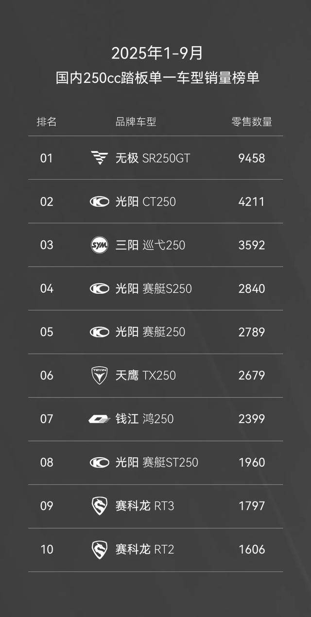 近日發(fā)布的2025年1-9月摩托車銷量數(shù)據(jù)顯示,250cc踏板車市場呈現(xiàn)顯著格局變化。無極品牌旗下SR250GT車型以9458臺的累計銷量登頂細(xì)分市場榜首,其銷量較第二名實現(xiàn)翻倍增長,與光陽250系列全系車型的總銷量差距已微乎其微,成為當(dāng)之無愧的年度爆款車型。