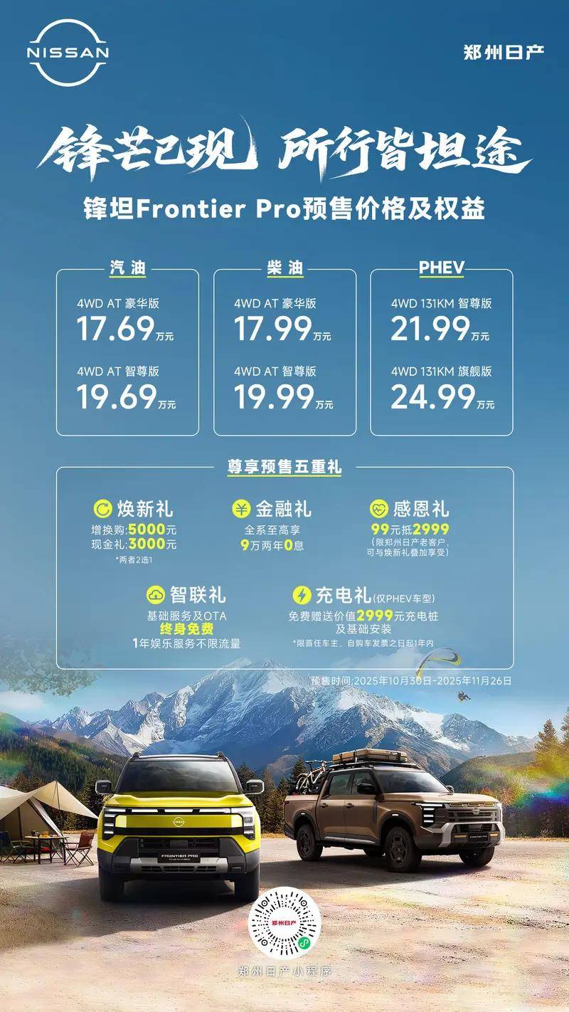 日產汽車正式宣布,旗下全新皮卡車型Frontier Pro開啟預售,此次共推出6款不同配置版本,預售價區間為17.69萬元至24.99萬元。作為日產首款在中國完成設計、研發并生產的全球化車型,新車在動力系統上提供了豐富的選擇,涵蓋汽油、柴油以及插電混動三種類型,滿足不同消費者的需求。