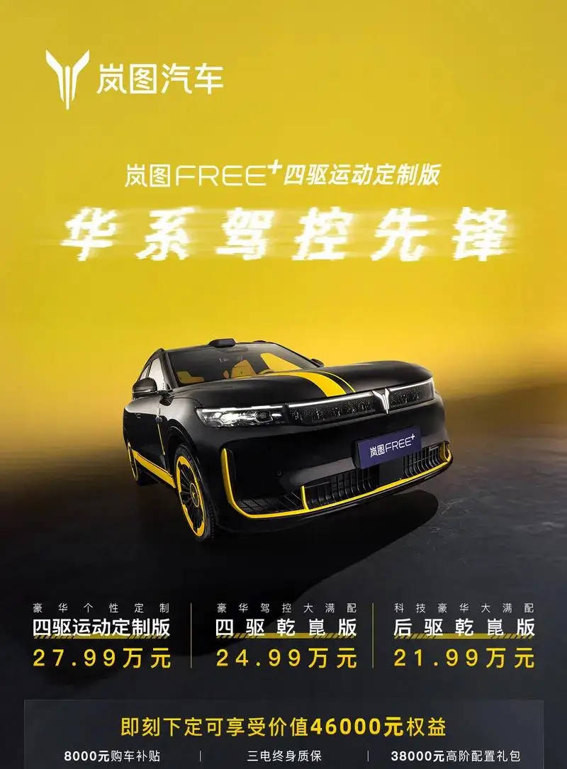 近日,嵐圖汽車正式對外發布了FREE+四驅運動定制版的官方圖片,同時宣布該車型售價為27.99萬元。為了回饋消費者,品牌方還推出限時下定優惠活動,即刻下單可享受總價值高達46000元的購車權益,其中包括8000元的購車補貼、三電系統終身質保服務,以及價值38000元的高階配置升級禮包。