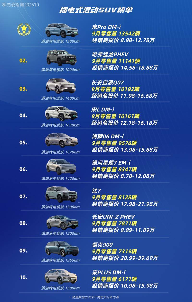 2025年9月銷量數(shù)據(jù)顯示,比亞迪宋Pro DM-i以13542輛的月銷量穩(wěn)居榜首。該車型在10月推出的2026款升級版中,NEDC百公里虧電油耗降至3.2L,并新增冰珀青外觀配色。值得關(guān)注的是,比亞迪宋家族累計銷量已突破380萬輛,其中另一款車型宋L DM-i也躋身當(dāng)月銷量前五。長城汽車推出的哈弗猛龍PHEV以11141輛的月銷量位列第二,其硬派外觀與高效混動系統(tǒng)的組合,精準(zhǔn)契合年輕消費者對個性化與實用性的雙重需求。