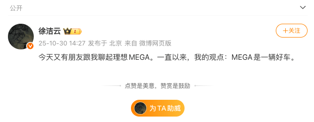 小米集團(tuán)董事長特別助理、戰(zhàn)略市場部副總經(jīng)理徐潔云近日在社交平臺公開表達(dá)了對理想汽車旗下車型MEGA的認(rèn)可。他表示,這款產(chǎn)品自上市以來便持續(xù)受到關(guān)注,其綜合表現(xiàn)值得肯定。