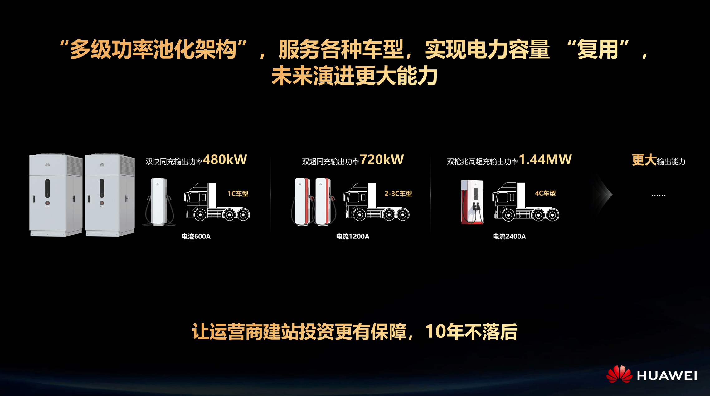 在商業模式創新方面,華為提出功率主機共享架構。該設計使場站既能服務乘用車也能適配兆瓦超充,投資回報周期延長至車型技術迭代周期之外。四川綿陽場站部署的53個兆瓦車位與118個雙槍超充車位,已向電動礦卡場景延伸出2.88兆瓦補能能力。這種模塊化設計使運營商可根據運輸車輛類型靈活配置終端,60%-70%的核心投資集中在可復用的功率主機上。