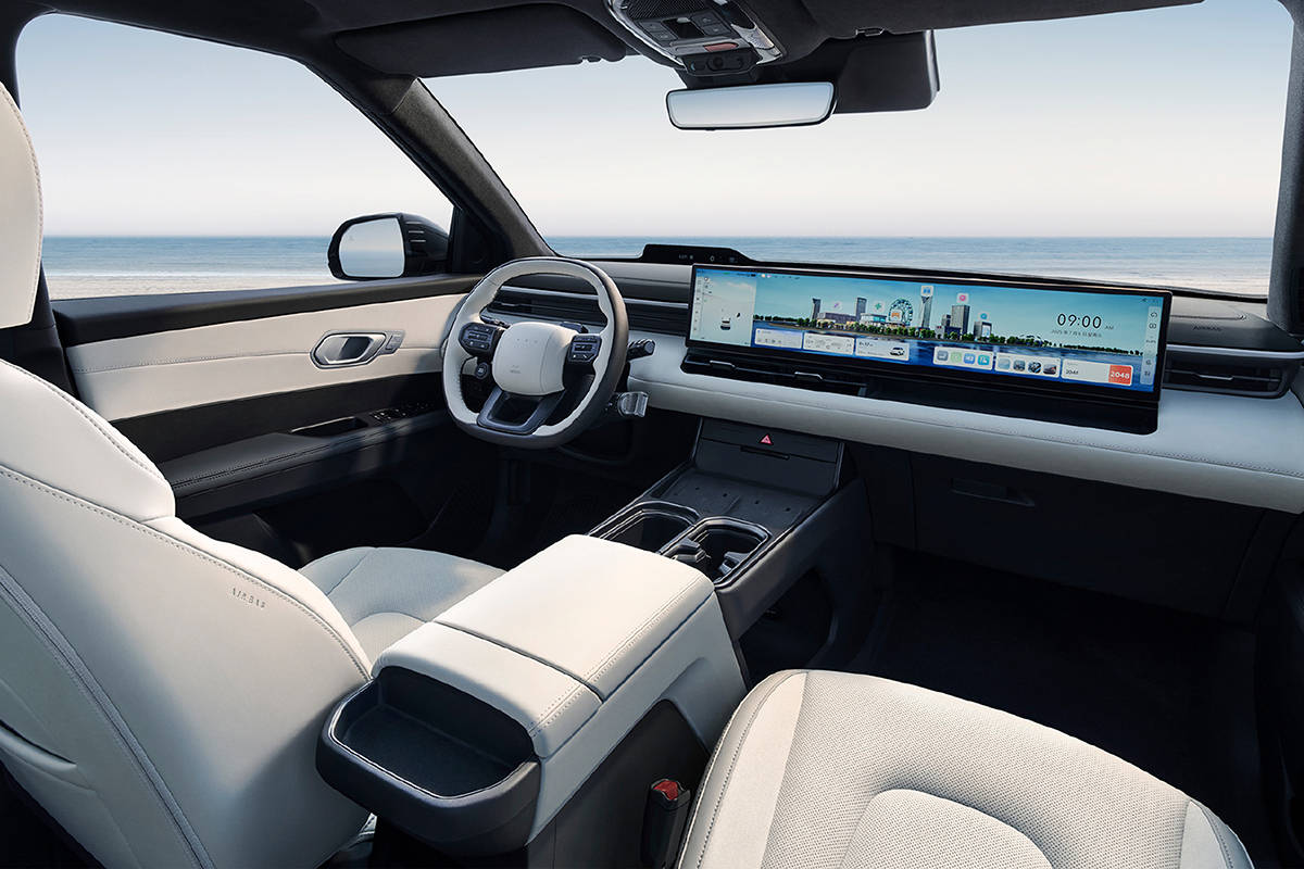 進入座艙,錯層式中控臺構建出立體空間感。27英寸雙聯屏整合了儀表盤與副駕娛樂功能,配合AR-HUD形成三屏聯動系統。雙色方向盤采用皮質包裹,觸感細膩。副儀表臺區域創新設計雙無線充電板與四杯架組合,底部鏤空儲物空間可容納隨身物品。貫穿式空調出風口與鍍鉻飾條的組合,則進一步提升了內飾的橫向延展性。