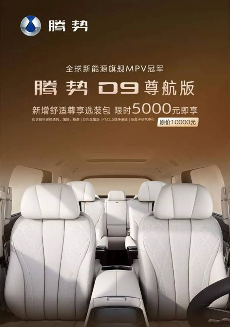 近日,騰勢品牌針對旗下中大型MPV車型推出限時優惠活動,涉及騰勢D9 DM-i兩驅尊航型、四驅尊航型以及騰勢D9 EV兩驅尊航型三款車型。消費者僅需支付5000元即可選購原價10000元的“舒適尊享選裝包”,該選裝包包含前排座椅通風、加熱、按摩功能以及方向盤加熱配置,顯著提升駕乘舒適性。