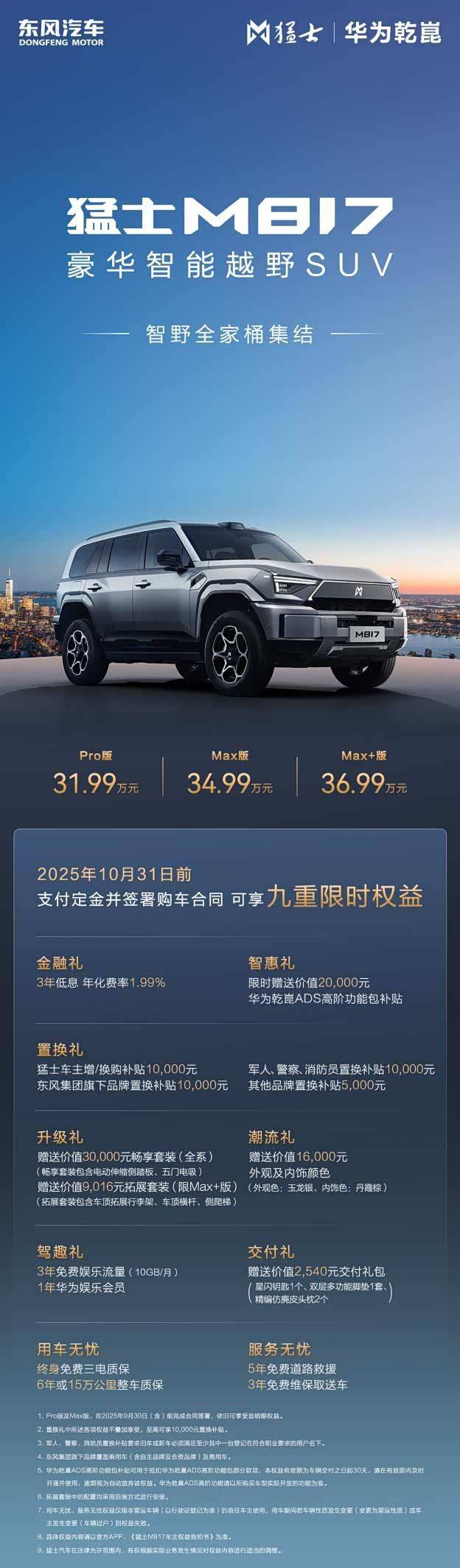 東風猛士科技與華為攜手打造的豪華智能越野SUV——猛士M817 Max+版正式登場,官方指導價定為36.99萬元。即日起至10月31日,支付定金并簽署購車合同的用戶,可享受九重限時權益,開啟全域智野新體驗。