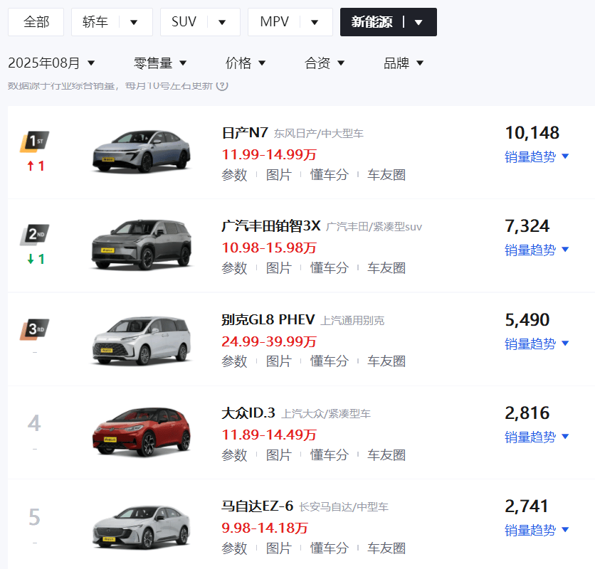 市場表現方面,合資新能源車型已形成差異化競爭格局。數據顯示,2025年8月純電動中大型轎車日產N7以10148輛的月銷量登頂合資新能源榜首,該車型自4月上市后僅用4個月便突破萬輛大關。緊隨其后的廣汽豐田鉑智3X和別克GL8 PHEV分別以8762輛和7543輛位列二三名,展現出合資品牌在混動和純電領域的雙重發力。
