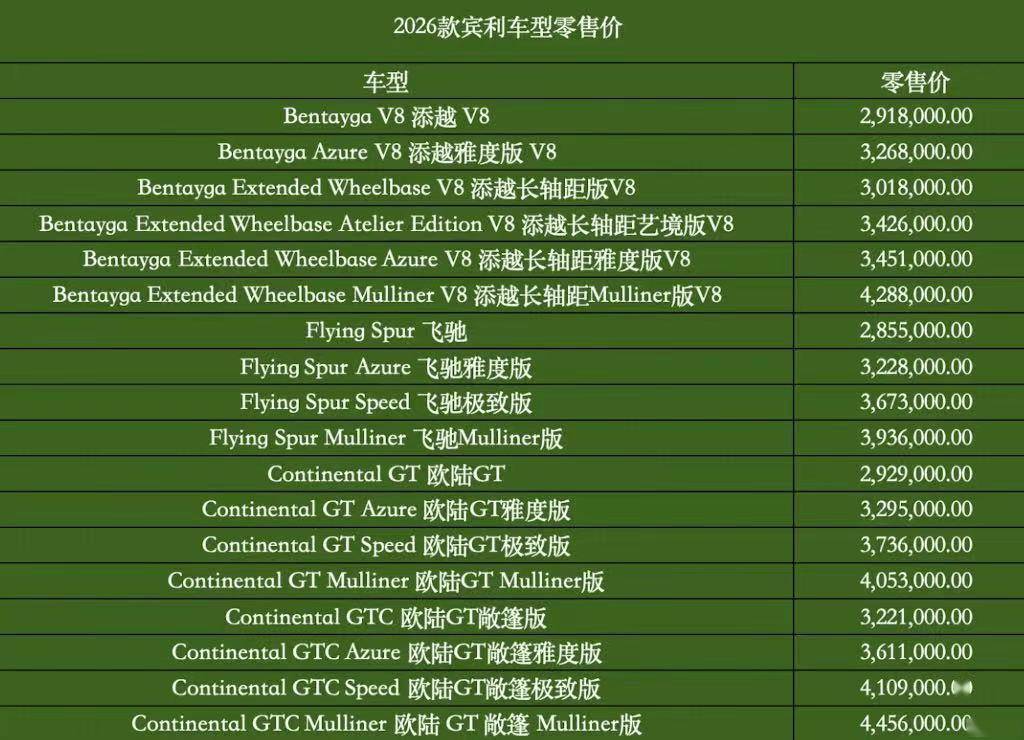 近日,賓利汽車正式推出2026款全系車型,涵蓋添越、飛馳及歐陸GT三大產品線。其中,新款添越提供6款配置,售價區間為291.8萬元至428.8萬元;飛馳系列推出4款車型,定價285.5萬元至393.6萬元;歐陸GT則以8款車型陣容亮相,售價292.9萬元至445.6萬元。