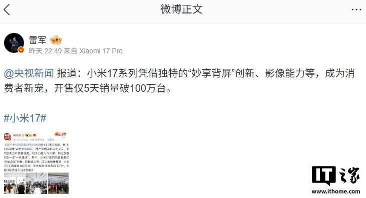 小米17系列手機(jī)自開售以來市場(chǎng)表現(xiàn)亮眼,據(jù)央視新聞此前報(bào)道,該系列機(jī)型在正式發(fā)售后的5天內(nèi)銷量便突破百萬臺(tái)大關(guān),這一數(shù)據(jù)隨后得到小米創(chuàng)始人雷軍的轉(zhuǎn)發(fā)確認(rèn)。
