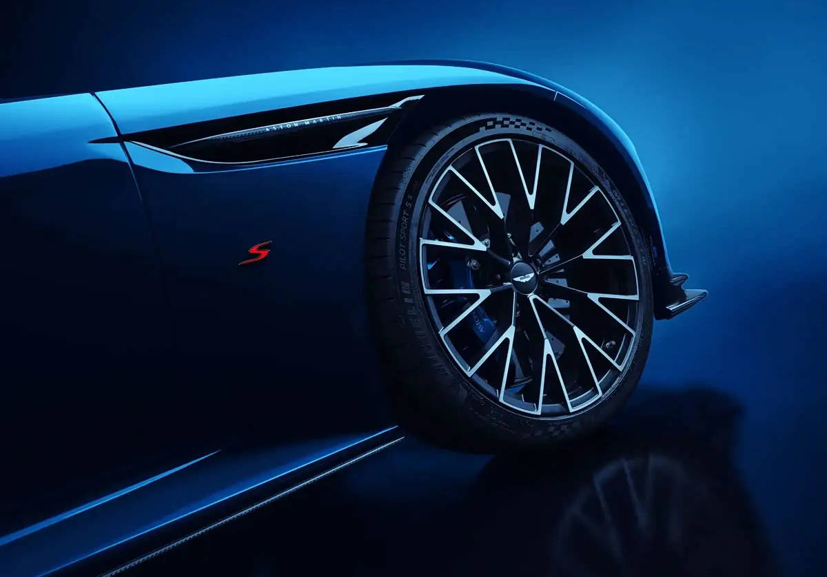 外觀造型延續(xù)了阿斯頓·馬丁的激進設(shè)計語言。前臉標志性的大尺寸進氣格柵搭配運動化前唇,營造出強烈的攻擊性。車側(cè)采用雙色車身設(shè)計,下半部藍色涂裝與上半部黑色懸浮車頂形成鮮明對比,前翼子板處的紅色"S"徽標則彰顯其高性能身份。標配的碳陶剎車系統(tǒng)在普通版DB12上需額外支付1.45萬美元選裝,此次成為S版本的標準配置。