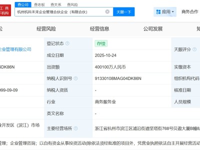 杭州杭科未來企業管理合伙企業成立 出資額約40億