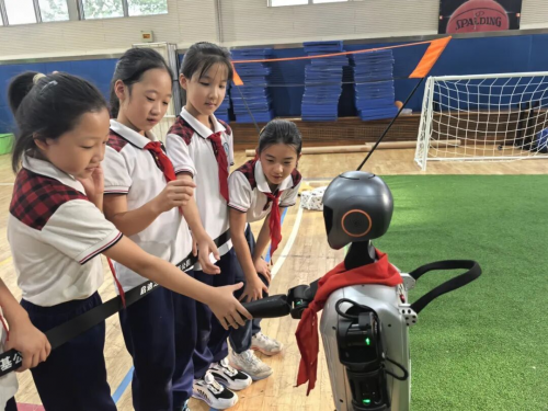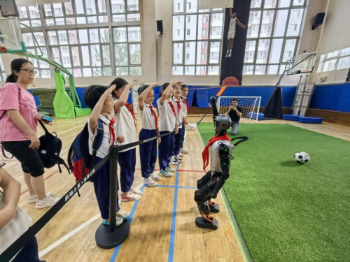 開幕式結束后,硅基公園在學校體育館搭建了主題為“未來已來——人工智能與具身智能主題體驗館”,各類AI大模型體驗項目和機器人展區引人入勝。機器狗接力賽場上,裝載智能程序的機器狗在同學們的操縱下敏捷穿梭于錐桶障礙間,精準完成接力動作,引發圍觀學生陣陣喝彩。機器人飛花令項目則生動呈現出文理交融的魅力。機器人精準識別語音并應答詩句,偶爾出現的趣味性誤差更激起全場善意的歡笑。“原來機器人能和我們共誦古詩!”來自景山學校遠洋分校六年級學生雀躍道,“這讓我真切感受到傳統文化與科技的交融之美。”