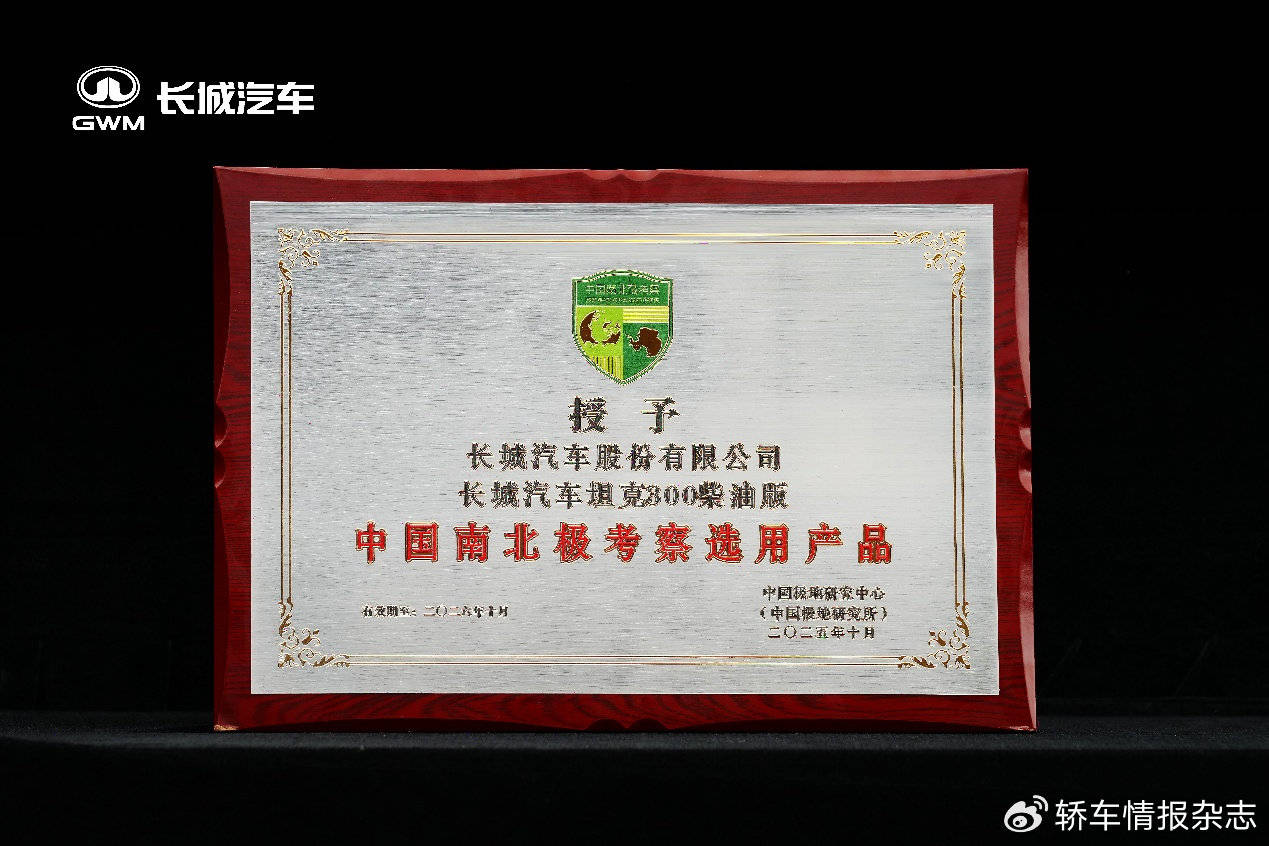 在授牌儀式環節,坦克300柴油版正式獲頒"中國南北極考察選用產品"證書。這款量產車型將直接承擔南極長城站的物資運輸與人員保障任務,成為首款未經改裝即投入極地實戰的民用越野車。其搭載的2.0T柴油發動機與全時四驅系統,在低溫啟動、燃油經濟性及通過性方面表現突出,特別適配南極復雜地形。