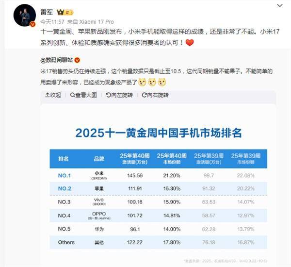 小米創(chuàng)始人雷軍在社交平臺(tái)轉(zhuǎn)發(fā)相關(guān)報(bào)道時(shí)特別強(qiáng)調(diào),此次勝利源于產(chǎn)品力與用戶體驗(yàn)的雙重突破。他指出,在十一假期手機(jī)銷量前五的品牌中,小米以顯著優(yōu)勢(shì)領(lǐng)先蘋果、vivo、OPPO和華為,這既是技術(shù)積累的成果,也是品牌戰(zhàn)略轉(zhuǎn)型的成功驗(yàn)證。面對(duì)蘋果年度旗艦的同步發(fā)售,小米通過差異化競(jìng)爭(zhēng)策略贏得市場(chǎng)青睞。