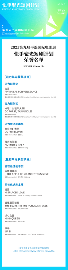 9月29日,第九屆平遙國際電影展“平遙之夜”榮譽盛典盛大舉行,揭曉本屆影展官方展映單元各項榮譽的最終得主。共8部作品從“快手聚光短劇計劃”入圍項目中脫穎而出。其中,在磁力單元,《寶鑒》獲得磁力劇擎獎,《沖吧!出租車大叔!》獲得磁力劇創獎,《奮斗吧!老爸》《母親的假面》獲得磁力優選劇本獎。在星芒單元,《畫中霜絲緣》獲得星芒最佳劇本獎,《錯愛》《瓷瓶里的秘密》《讀心女王》《甲子》獲得星芒優選劇本獎。