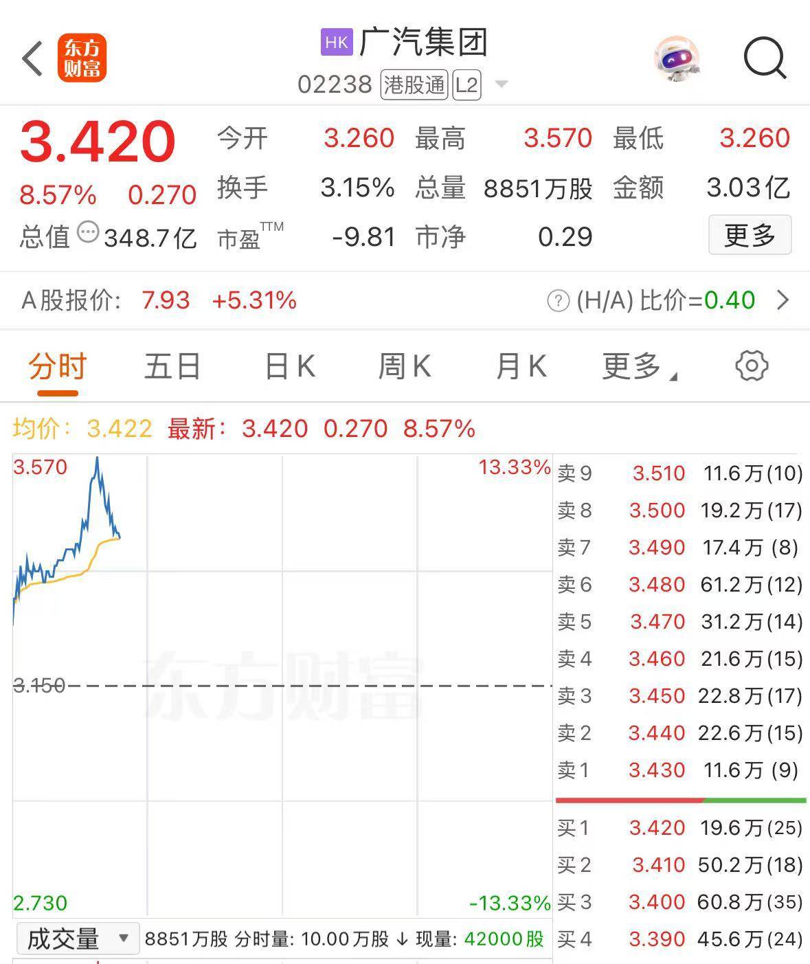 10月15日,廣汽集團(tuán)在港股市場(chǎng)表現(xiàn)亮眼,股價(jià)早盤(pán)高開(kāi)高走,盤(pán)中漲幅一度突破13%。截至上午10時(shí)35分,雖然股價(jià)有所回落,但仍保持8.57%的漲幅,最終報(bào)3.42港元/股。