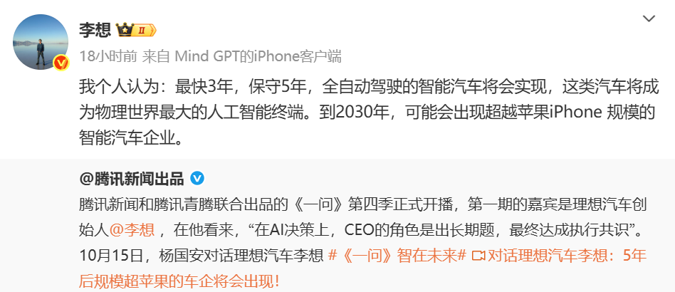 李想認(rèn)為,當(dāng)前技術(shù)迭代速度已突破傳統(tǒng)汽車工業(yè)的發(fā)展框架,基于多模態(tài)感知系統(tǒng)與高精地圖的深度融合,智能汽車正從輔助駕駛向全場景自動(dòng)駕駛跨越。他特別強(qiáng)調(diào),2030年前后或?qū)⒄Q生市值超越蘋果iPhone巔峰期的智能汽車企業(yè),這類企業(yè)不僅掌握核心技術(shù),更將重新定義移動(dòng)出行生態(tài)。