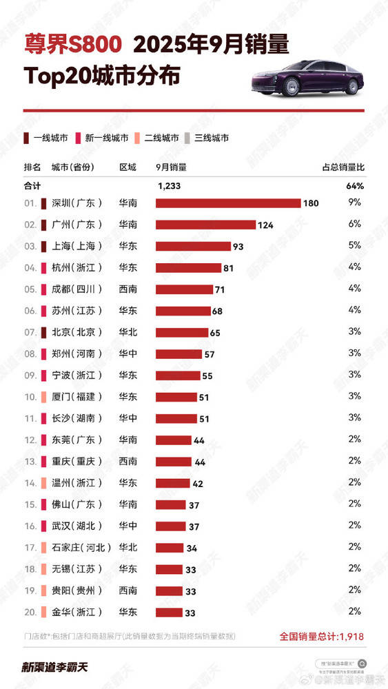 據統(tǒng)計,TOP20城市累計銷量達1233輛,占全國總銷量的64%。其中,華東地區(qū)8座城市(主要集中于江浙地區(qū))的銷量占比最高,華南次之,華中與西南持平,華北則相對較低。這一分布格局反映出尊界S800在不同區(qū)域的市場滲透力存在顯著差異。