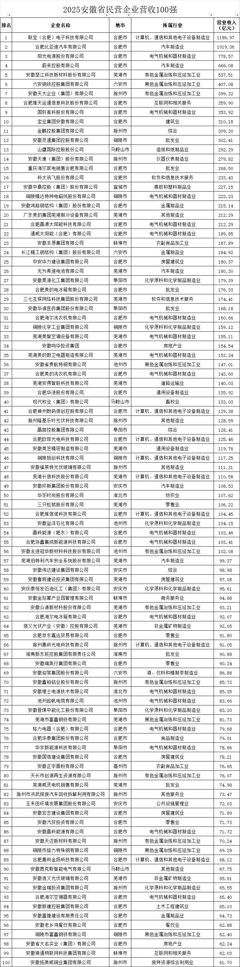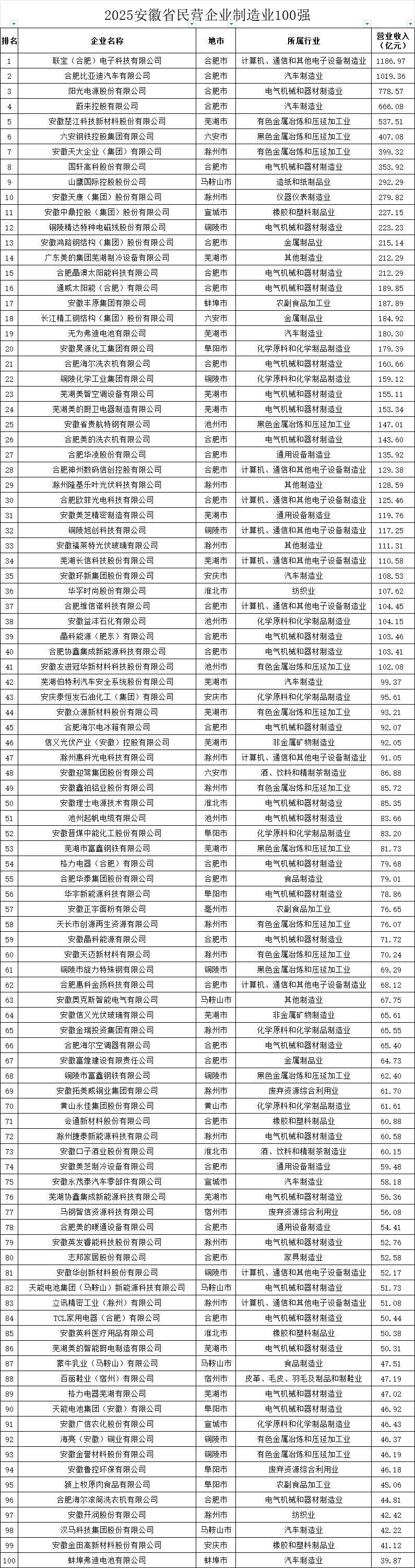 在營收百強榜單中,聯寶(合肥)電子科技有限公司以強勁表現蟬聯榜首,合肥比亞迪汽車有限公司、陽光電源股份有限公司緊隨其后。蔚來控股有限公司與安徽楚江科技新材料股份有限公司分別占據第四、第五位,形成頭部企業集聚效應。值得關注的是,這五家企業同時包攬了制造業百強前五名,彰顯出安徽制造業的雄厚實力。