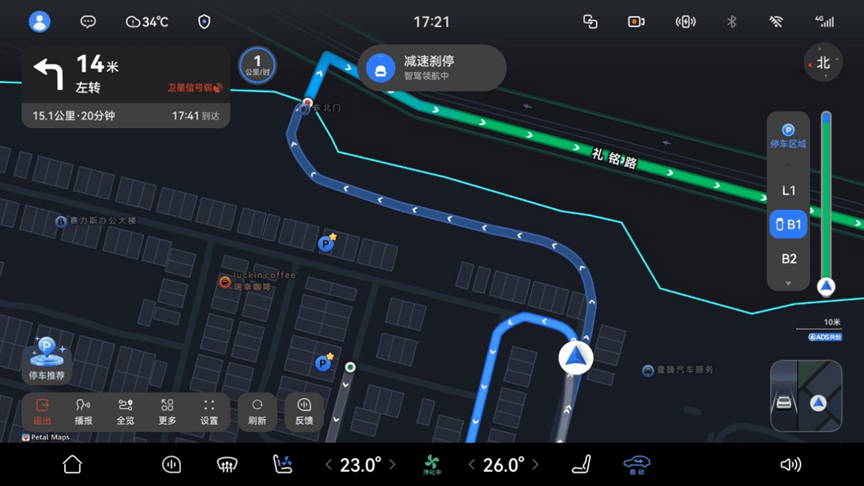 智能泊車系統迎來2.0時代革新。新上線的"車位到車位"功能覆蓋全國超50萬停車場,用戶可通過地圖界面直接點擊目標車位,一鍵啟動"車位級"導航,全程無需手動干預。該功能支持小區、商超、寫字樓等高頻停車場景的無縫銜接,實現從出發到停放的連貫體驗。泊車輔助系統新增自定義車位記憶功能,可存儲用戶偏好的停車位置和姿態(如靠左停放),系統會自動適配不同車位的泊入策略。實時渲染感知界面(SR)支持"可見即可泊",當車輛低速行駛時,界面自動顯示周邊可泊車位,用戶選定后無需切換擋位即可激活泊車,操作時間大幅縮短。