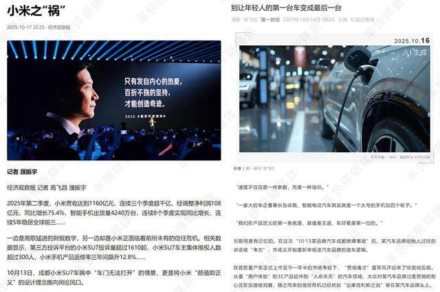 主流媒體的跟進報道將爭議推向高潮。10月16日,第一財經發表題為《別讓年輕人的第一臺車變成最后一臺》的深度報道,該文在三天內創下超10萬閱讀量與萬次轉發。文章直指小米汽車在安全設計、應急機制等核心環節存在重大隱患,特別強調"智能汽車不能只有智能,更要保命"的行業警示。