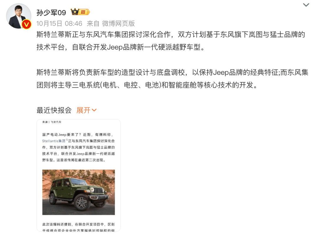 此次,Stellantis將目光投向了東風汽車旗下的猛士品牌,計劃在未來18個月內開發一款新的Jeep車型。該車型將由Jeep自主設計,但在動力系統、智能座艙系統和輔助駕駛技術等方面依賴東風的技術支持。
