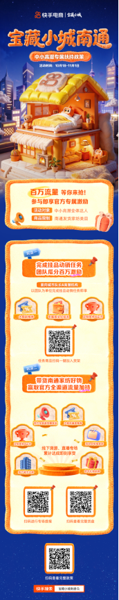 此外,貨架型商家將有機會獲得百萬曝光活動會場資源、商城大牌大補補貼等多維支持,實現強勢曝光和高效轉化。而短視頻型商家帶指定話題#寶藏小城南通,發布預約指定直播大場、掛鏈指定貨盤短視頻,則可獲得粉條激勵、流量加碼,從短直雙域實現聲量與銷量雙豐收。