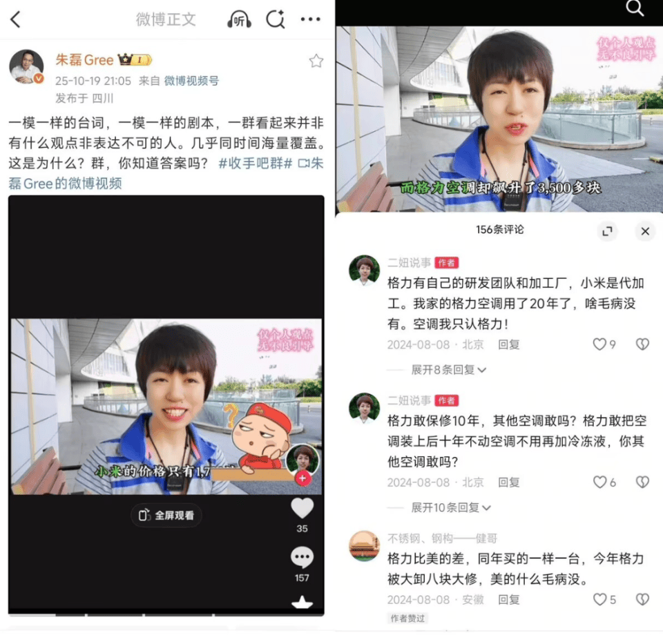 事件的導火索源于格力市場總監朱磊的一條微博。他發現,近期網絡上突然涌現大量短視頻,內容均以“小米1.5匹空調不到1700元,格力要3000多元”為開頭,隨后話鋒一轉,強調“格力用料扎實、技術領先、品質可靠,貴有貴的道理”。朱磊認為,這些視頻是小米雇傭的“黑公關”行為,試圖通過對比價格貶低格力。