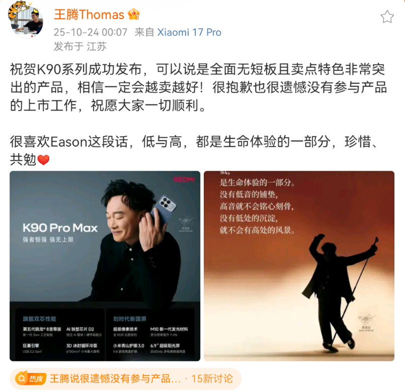 自10月17日紅米手機官宣發布會時間起,王騰便通過微博表達對產品的關注。他轉發官方信息并透露,K90 Pro Max的研發團隊傾注了大量心血,預祝新品發布順利。23日發布會當天凌晨,他再次發文稱贊該系列為"全面無短板且賣點突出"的產品,雖遺憾未能參與上市工作,仍送上誠摯祝福。這一系列舉動迅速引發網友熱議,相關話題登上微博熱搜榜。