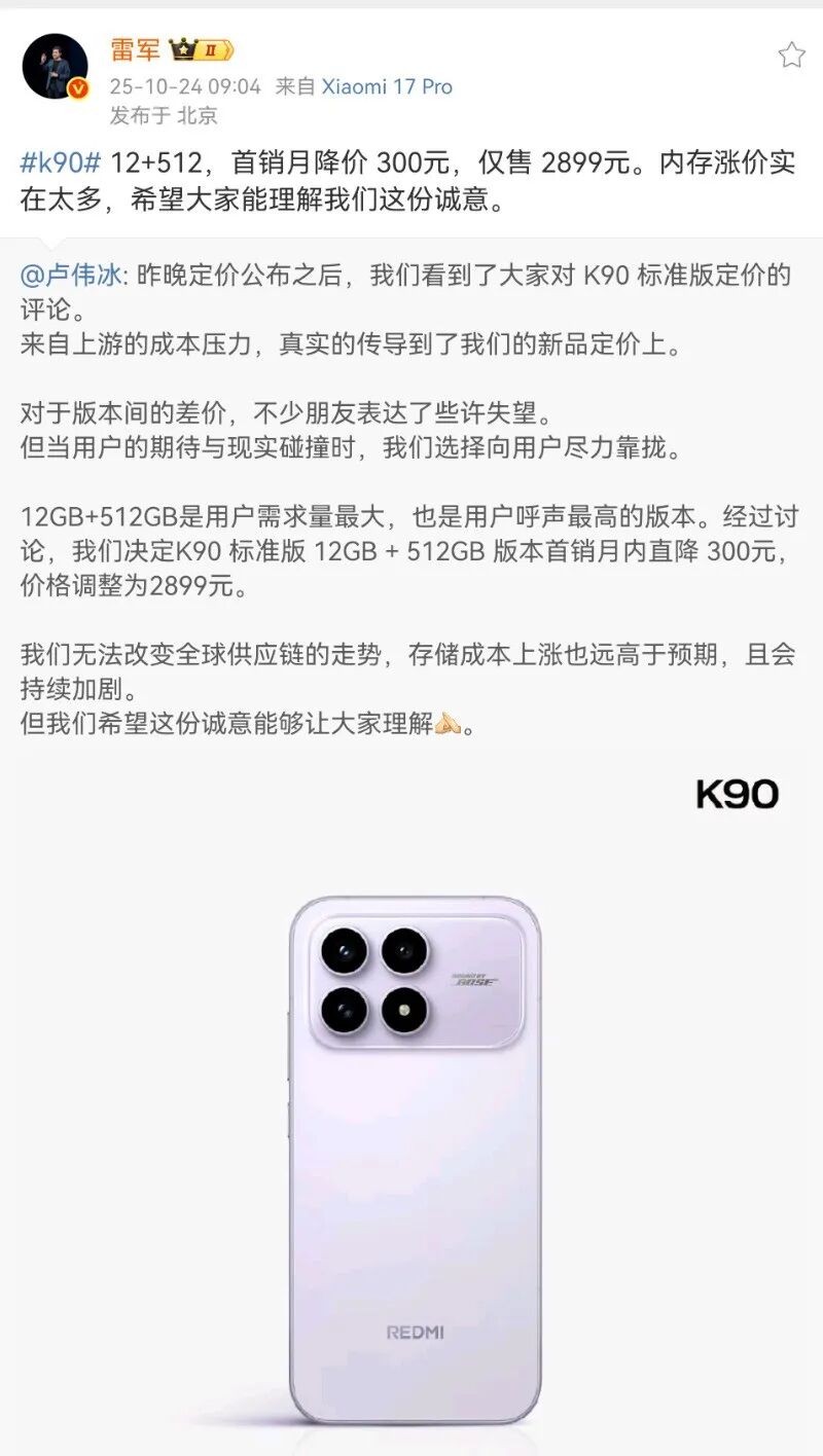 面對市場對定價的質疑,小米管理層迅速作出回應。盧偉冰公開解釋稱,受全球供應鏈成本上漲影響,存儲器件價格漲幅遠超預期且持續加劇。為回饋消費者,公司決定將K90標準版12GB+512GB版本在首銷月內直降300元,調整后售價2899元。他強調這一決策體現了企業的誠意,希望用戶理解行業現狀。小米創始人雷軍隨后轉發該聲明,進一步說明內存漲價的實際情況。