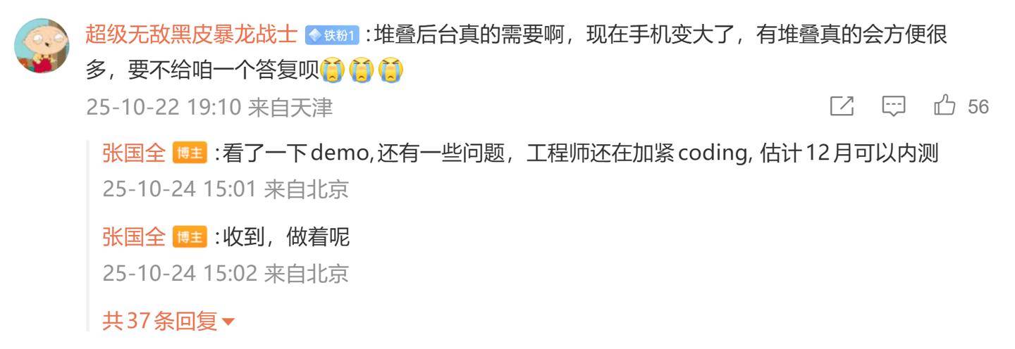 事件起因于10月22日,某用戶在張國(guó)全轉(zhuǎn)發(fā)的技術(shù)訪談微博下留言,指出當(dāng)前大屏手機(jī)缺乏高效的后臺(tái)管理方案。該用戶特別提到,若能實(shí)現(xiàn)按應(yīng)用啟動(dòng)時(shí)間排序的堆疊式后臺(tái)界面,將顯著提升多任務(wù)處理效率。這種設(shè)計(jì)允許用戶通過橫向滑動(dòng)查看后臺(tái)應(yīng)用,每個(gè)程序卡片會(huì)以動(dòng)態(tài)效果依次展開,既保證信息完整性又提升操作直觀性。