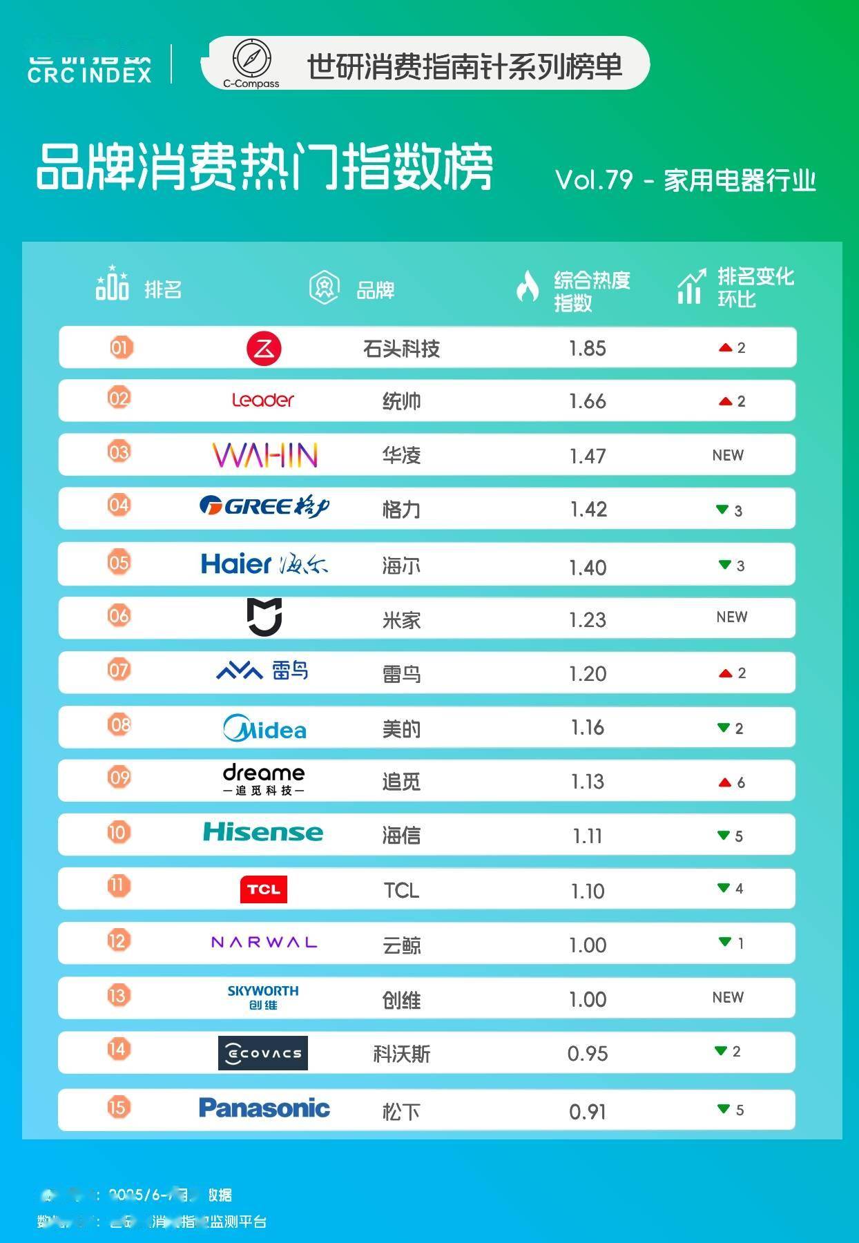 近期發布的世研消費指南針系列指數報告顯示,在綜合熱度指數榜單中,石頭科技、統帥和華凌分別以1.85、1.66和1.47的指數值占據前三位。該榜單通過多維度數據監測,客觀反映了家電市場的消費趨勢與品牌競爭力。