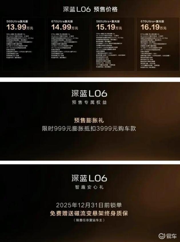 從配置梯度來看,深藍L06的定價策略頗具巧思。入門版以13.99萬元的價格提供完整的智能駕駛與豪華配置,670Ultra版則通過1萬元的價差實現續航突破。對于追求極致體驗的用戶,頂配車型在懸架、座椅、音響等領域的全面升級,展現出超越價格的價值感。這種精準的產品定位,既滿足了預算敏感型消費者的核心需求,也為追求品質的用戶提供了進階選擇。