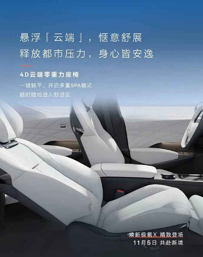 內(nèi)飾方面,新款極氪X延續(xù)了極簡(jiǎn)主義設(shè)計(jì)風(fēng)格,提供灰白與黑橘兩種雙色搭配方案。中控臺(tái)核心區(qū)域搭載一塊可電動(dòng)滑移的懸浮式大屏,支持橫向位置調(diào)節(jié),滿足不同駕駛場(chǎng)景需求。配置清單中,4D云端零重力座椅成為最大亮點(diǎn),該座椅支持多向電動(dòng)調(diào)節(jié)與按摩功能,配合后排坐墊電動(dòng)翻折技術(shù),可實(shí)現(xiàn)空間靈活變換。智能控溫中島冰箱、新一代LV調(diào)光天幕以及感應(yīng)式無(wú)框自動(dòng)門等配置的加入,進(jìn)一步提升了車內(nèi)科技感與實(shí)用性。