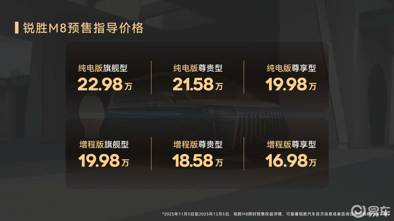 近日,北京汽車制造廠旗下獨立MPV品牌銳勝汽車正式開啟旗下首款車型——銳勝M8的預售活動。這款定位大型MPV的新車,以16.98萬元起的增程版預售價和19.98萬元起的純電動版預售價,為消費者提供了一個高質價比的購車選擇。在當前30萬級MPV市場占據主導地位的背景下,銳勝M8憑借其親民的價格和越級的產品力,有望打破市場格局。