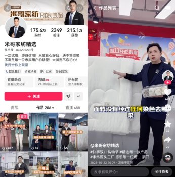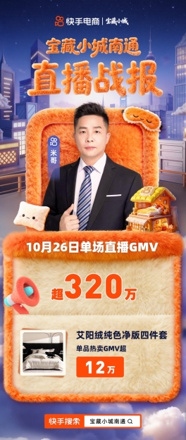 “真貨賣不過假貨的虧,我真的吃過。老百姓上過一次當,下一次一定不會再買了。”在家紡行業沉浮20年的@米哥家紡精選,在百萬粉絲前堅持“三不原則”——不賣差貨、不追風口、不亂開發,他堅信“料子實、人實在,路就不會斷”。這種對品質的堅守,也讓米哥在快手收獲了回頭客的爆發式增長。“寶藏小城”南通站活動期間,米哥在10月26日推出的一場直播GMV超320萬。