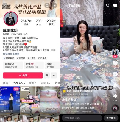 從全職寶媽到百人團隊老板、家紡品牌創始人,@威姐家紡 在快手用行動和實力證明了寶媽也能闖出屬于自己的一番事業。入駐快手7年來,威姐從靠一條卡通涼席視頻漲粉5萬,到3年干出千萬流水,始終致力于將最好的產品帶給每位用戶。