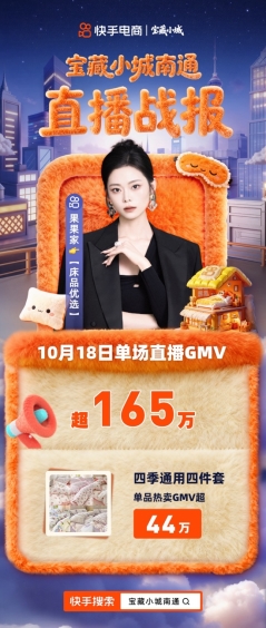 依托好的產品和實惠的價格,以及快手電商“寶藏小城”南通站活動的資源扶持,果果實現生意新增長。10月18日,果果單場直播GMV超過165萬,其中一款四季通用四件套更是成為熱賣爆品,單品GMV超44萬。