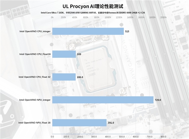 眾所周知這代處理器是英特爾首次在桌面端上引入NPU模塊,同時核顯也進行了全面加強,那我們自然得測試一下這顆處理器的AI表現如何。我們直接用UL Procyon的Intel OpenVINO進行測試。實測在float16以及integer下,NPU的表現非常驚艷,甚至以及超過了CPU本身的AI算力,部分場景下的性能表現甚至是CPU的兩倍!
