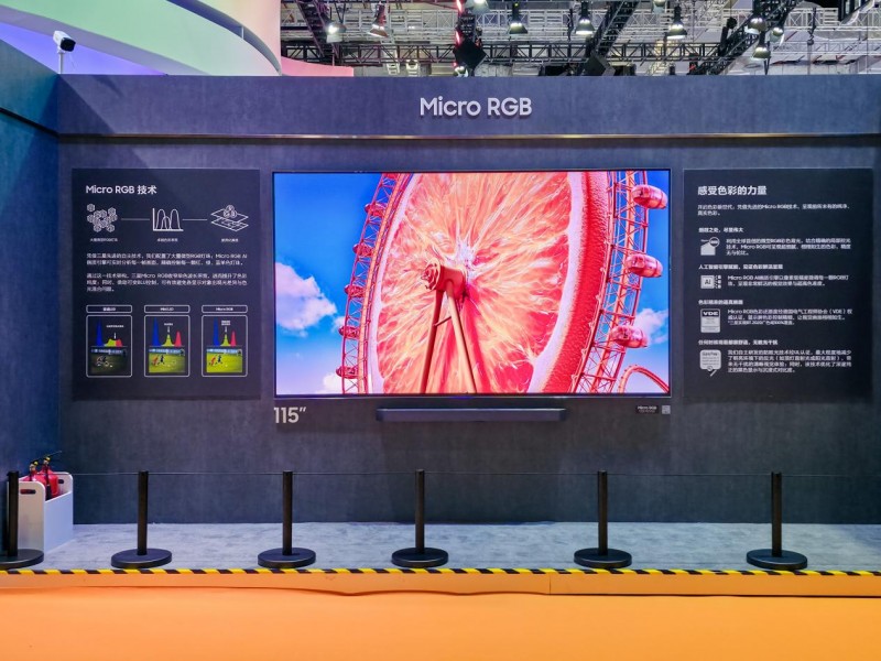 115英寸三星全球首款Micro RGB同樣實力非凡。這款在IFA 2025斬獲“杰出創新獎”的超高端產品,堪稱電視行業的里程碑之作。其采用自研的Micro RGB技術,在燈板上以超精細陣列排布紅、綠、藍三色微型RGB LED,每顆尺寸均小于100微米且可獨立控制,發光效率更高。三星Micro RGB以81Bit色彩映射技術確保畫面色彩的真實還原,并實現對BT.2020標準色域的100%覆蓋,該產品榮獲彩通(PANTONE)色彩認證與德國VDE頒發“Micro RGB 精準色彩”認證的雙重權威認可。憑借防眩光技術,即使在展區現場的明亮環境中,依舊保持畫質清晰逼真。三星Micro RGB以消費級市場微米級RGB LED技術的突破性落地,為全球顯示產業標定了兼具技術高度與市場價值的發展新航向。