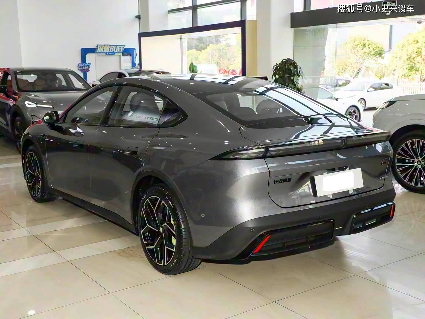 車身側(cè)面是深藍(lán)L06的視覺焦點(diǎn)。其長寬高分別為4830/1905/1480mm,軸距達(dá)2900mm,在中型車中優(yōu)勢(shì)顯著,甚至比比亞迪秦L的軸距多出110mm。上揚(yáng)的腰線從車頭延伸至車尾,勾勒出“前低后高”的動(dòng)感姿態(tài),溜背式車頂線條如液態(tài)金屬般流暢,既保留了轎跑的純粹質(zhì)感,又未過度犧牲頭部空間。無框車門與半隱藏式門把手的組合堪稱點(diǎn)睛之筆——門把手在靠近時(shí)自動(dòng)彈出,離開后自動(dòng)收回,既提升了儀式感,又讓車身側(cè)面更顯簡潔。實(shí)拍車型搭載的19英寸花瓣式輪轂搭配熒光綠剎車卡鉗,進(jìn)一步強(qiáng)化了運(yùn)動(dòng)氛圍,而豐富的車身顏色選擇,則能滿足不同用戶的個(gè)性化需求。